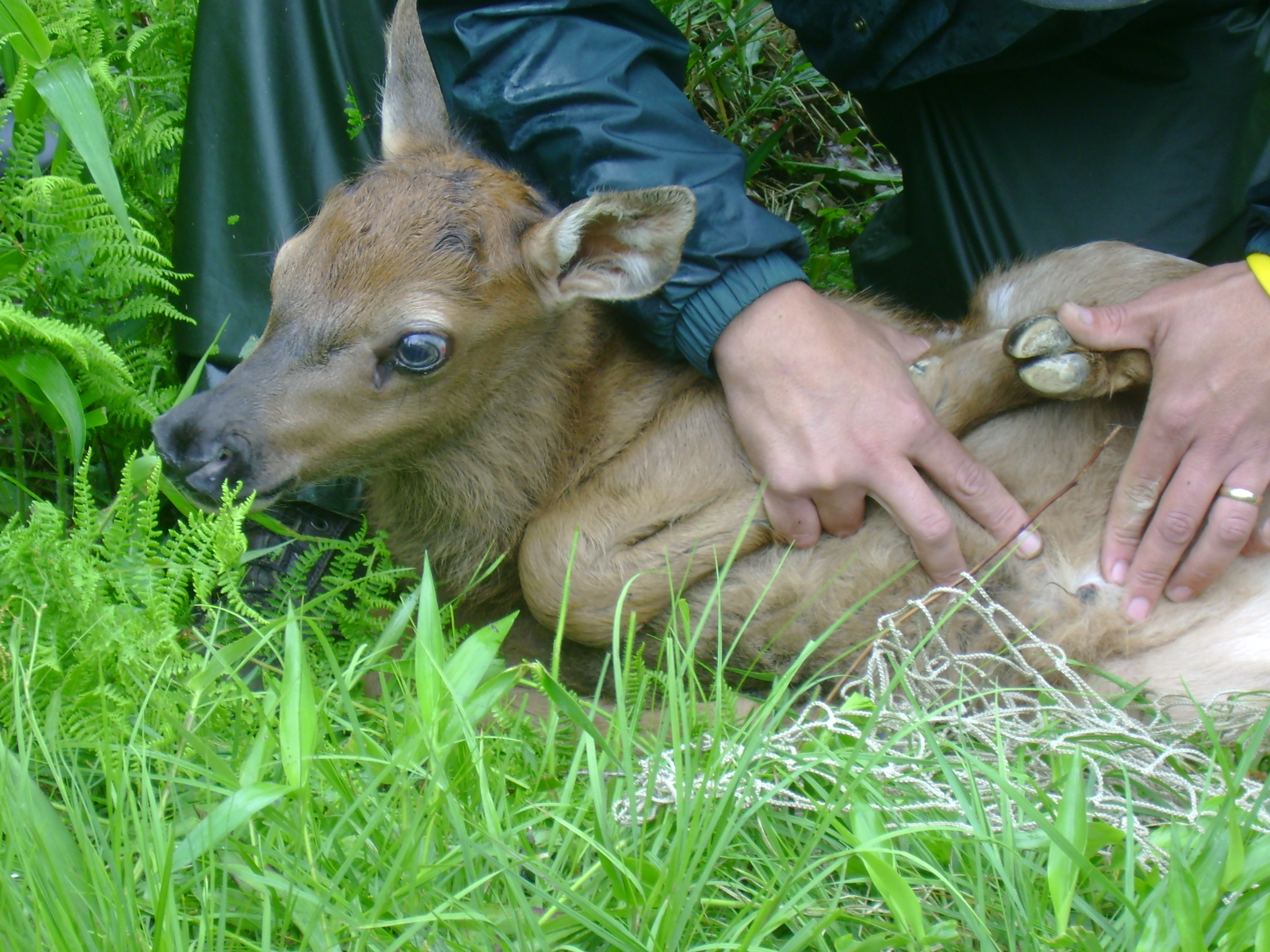 We waded through an ocean of hay-scented ferns, a parallel line combing the wet meadow. High-stepping over stumps, blackberry brambles snag at our sopping wet jeans. Glancing down the line of evenly spaced people, we caught one another’s eye. Where is it? All of a sudden someone lunged, and dropped to the ground, motioning us over. We trotted to their side, craning our necks around one another to see the elk calf bedded down in the soft green furls. Its brown fur was strewn with creamy spots, like dancing chips of sunlight. Eyes white and glassy as marbles bulged out of their sockets and the calf’s nostrils flared in and out. All else was still as it remained curled like a fetus, giving up to certain doom.