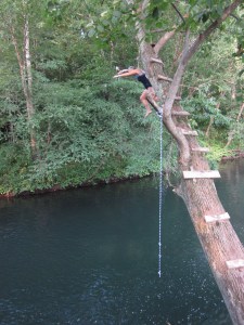 OK- and so we did it. We put on our bathing suits after the boys got home from painting houses. It helped that it was in the 90 degrees and sweaty. Drove down to the swimming/fishing hole and proceeded to climb up 25 feet into a tree. Bryce went first to “show us.” I followed and tried not to think. “Just do it.” I said to myself, and stepped off. It was fun. I got a load of water up my nose but truthfully, the first hill on a roller coaster is worse in the stomach.