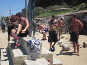 At the apex of Copacabana Beach and Ipanema Beach, there is an outdoor gym, where great hulking tan man, bedecked in tatoos, tans, and bulging muscles, lift bar belled weights made of concrete that was tamped into various sized plastic bucket molds. They help one another get into position on the horizontal concrete slab. There are no women present at this`gym. They work out inside gyms. All in Rio want to look their best or so I am told for they spend so much time nearly naked at the beach.