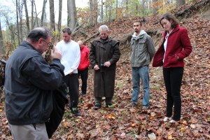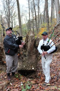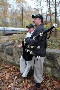 The small procession follows the lilting sound of the bagpipes through the narrow valley this November afternoon. The Chester County woods are open, the leaves gone from the branches and littering the forest floor so the music can spread out. Children living in the development along the rim of the valley, run outdoors to see what is going on. It is All Soul’s Day and a few dedicated souls of the living are walking to Duffy’s Cut to commemorate the souls that lost their lives in this historic place.