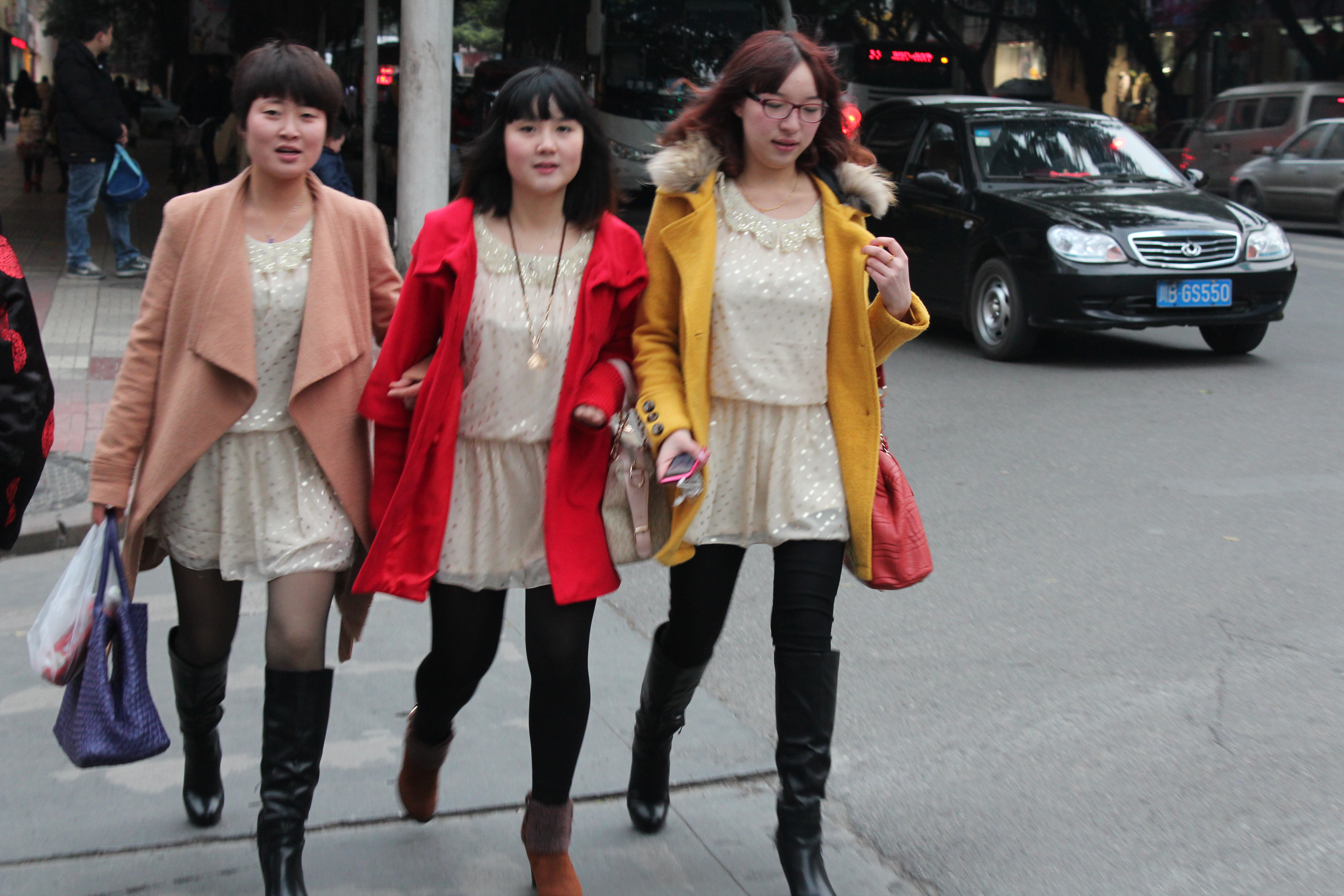 EVERYONE is dressed up. I didn’t see a scuffed shoe in one month. We looked rattier than the Chinese. Women wear fancy high-heeled boots, tights, short skirts and colorful winter jackets. The men all dress in solid black. Their image is of the utmost importance. I was told that they will not have money for heat, but they will buy the best looking clothing.