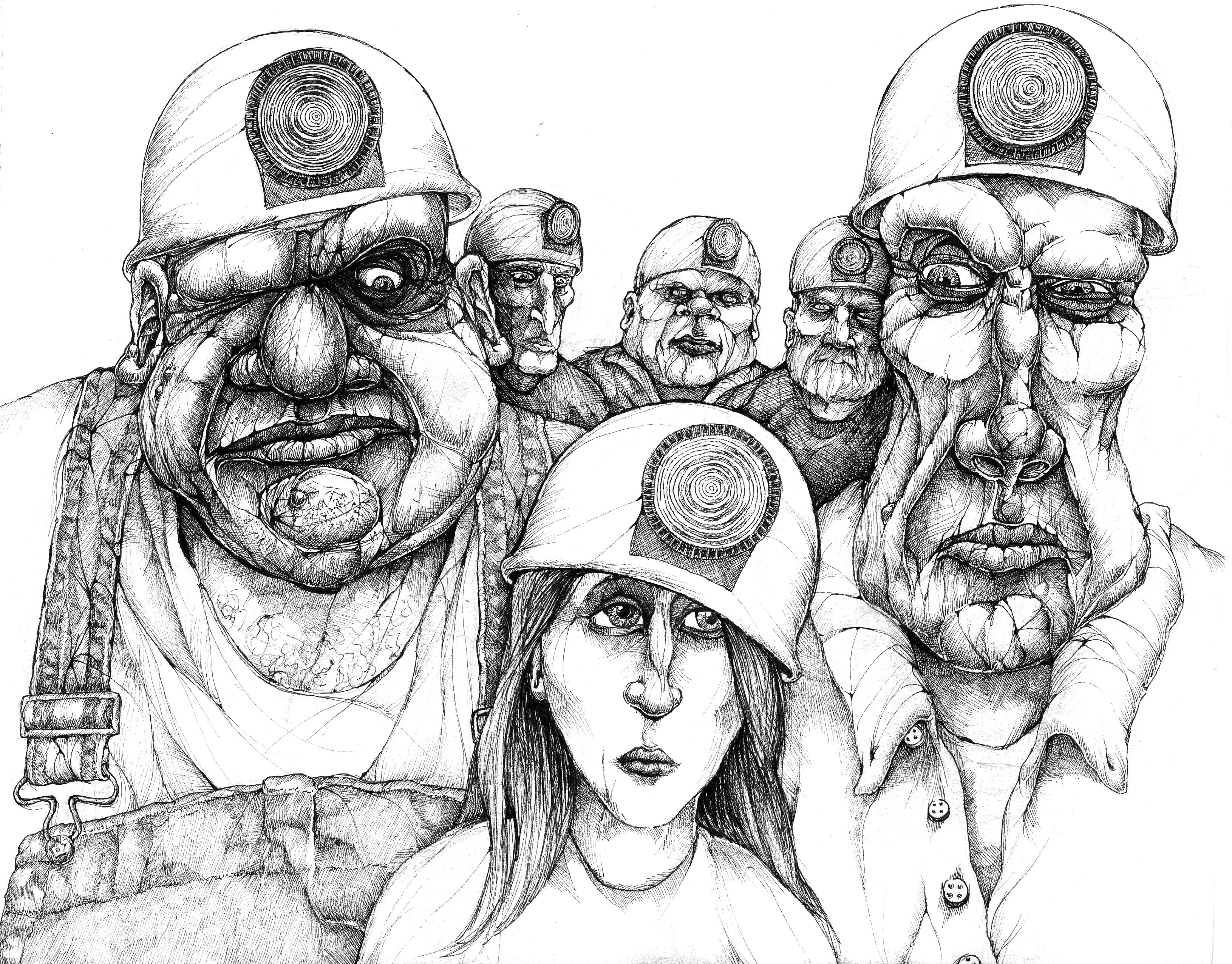 Back in 1975, the labor board told Bethlehem Steel’s Grace Mine in Morgantown, Pennsylvania, that they had to hire a certain quota of minorities and women to work in their underground iron ore mine. Perfect timing for me- a young woman with a burning desire to be a professional artist, looking for some big money. Underground mining was considered a very dangerous occupation so we got paid handsomely to enter a mile deep shaft into the bowels of the earth. There was an interesting ratio of men to women- 800 males, 12 women. A crash course in assertive training was about to begin.