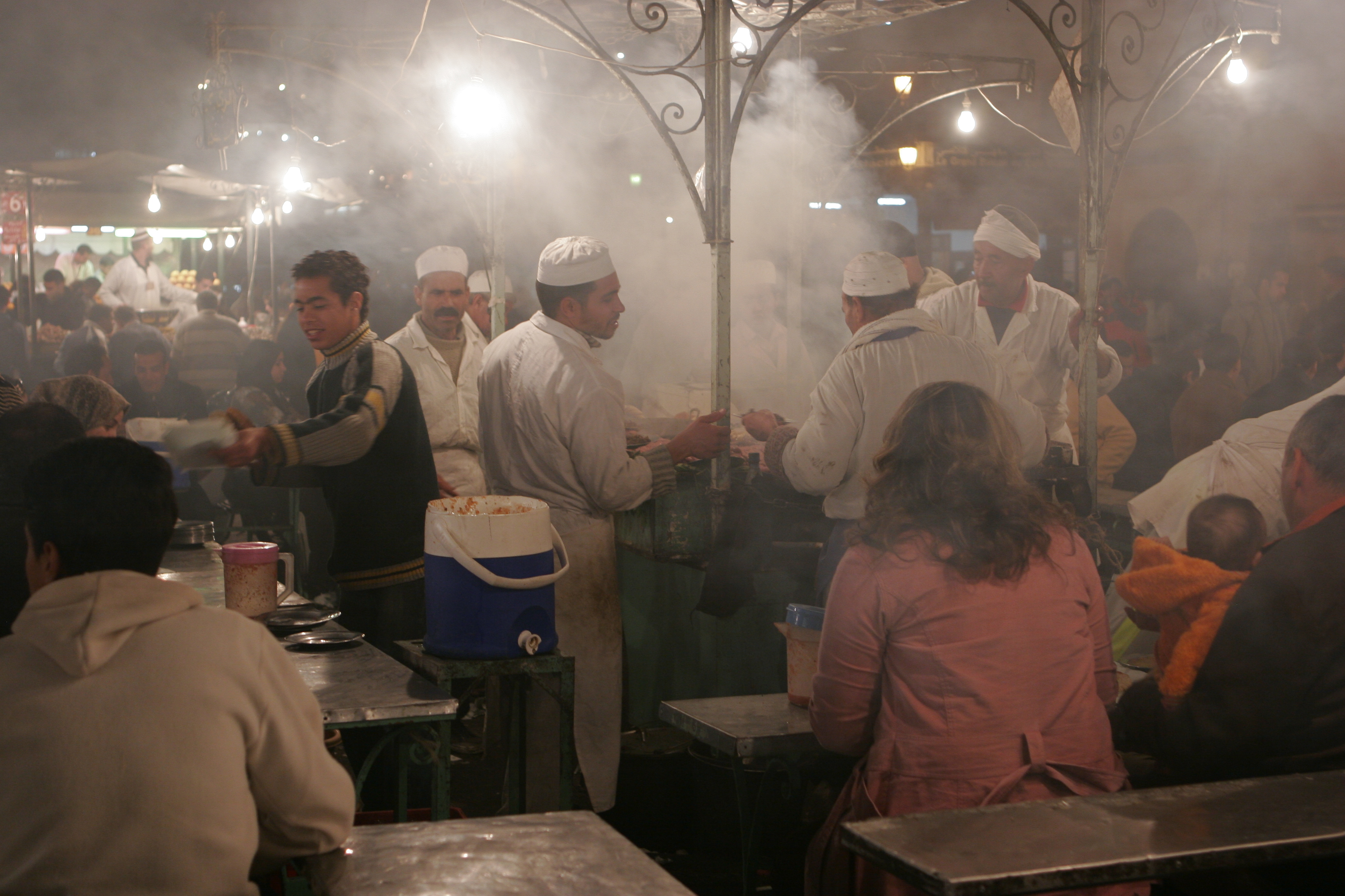 By nightfall the plaza is a hive of humanity. Like moths to a flame, we are attracted towards its lit center. Men wheel in food carts and cooking tents, banishing the snake charmers and their repetitive song. Soon pungent smoke clouds the air. Small greasy chefs busily fry small greasy sausages. Buckets of snails entice the passerby. Determined tattoo artists pursue us with syringes of henna, while we pursue the aroma of frying food.