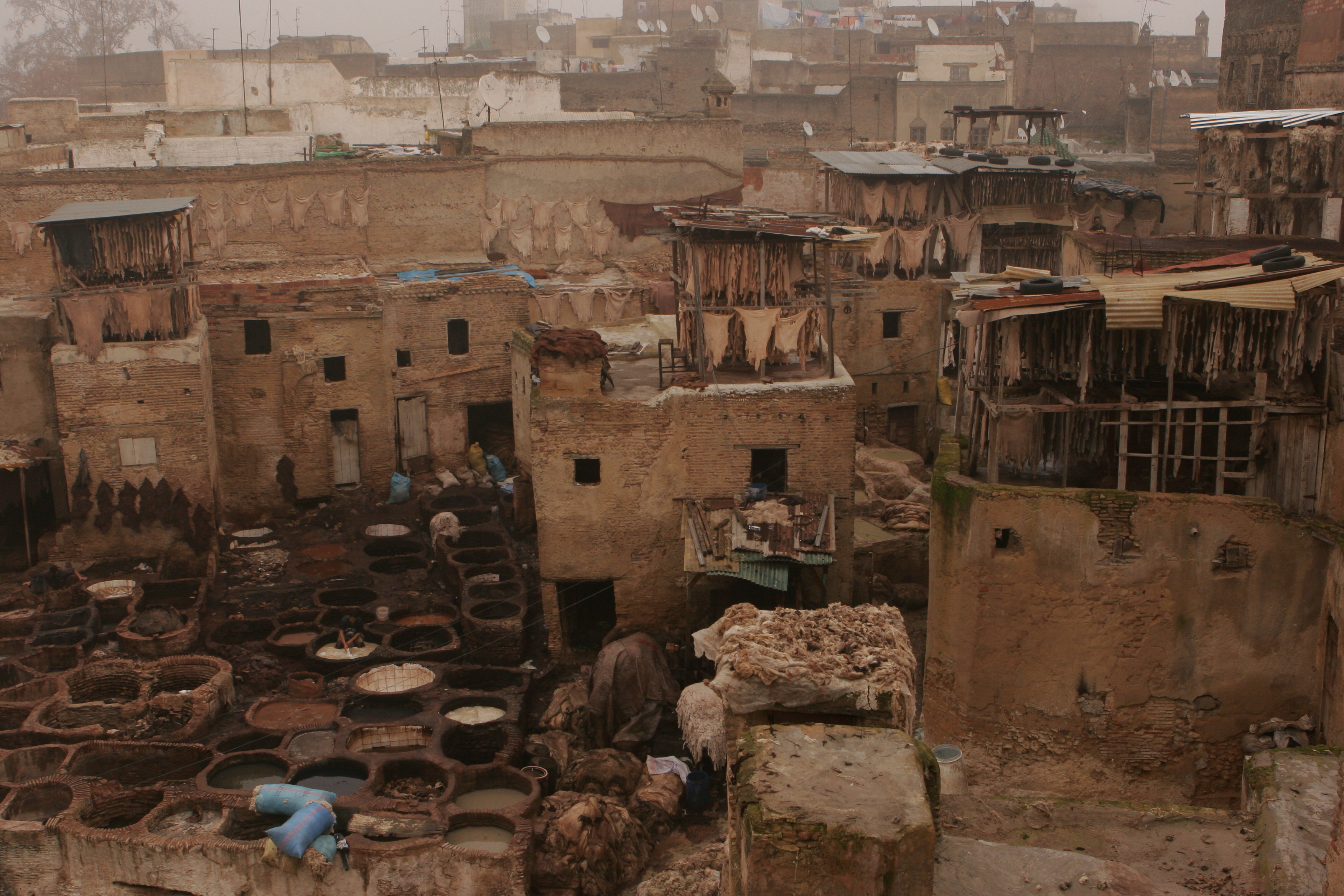 We wander between cracked, sunset-colored walls until we detect the stench of the tannery. The tannery is an open area with vats of water made milky with pigeon droppings. Workers slosh in the rank broth in nothing but shorts, laboring to tan sheep leather. It looks like a vast honeycomb, where men hang skins to dry and mangy cats wander the rims. We are handed sprigs of mint leaf to sniff to dull the stench.