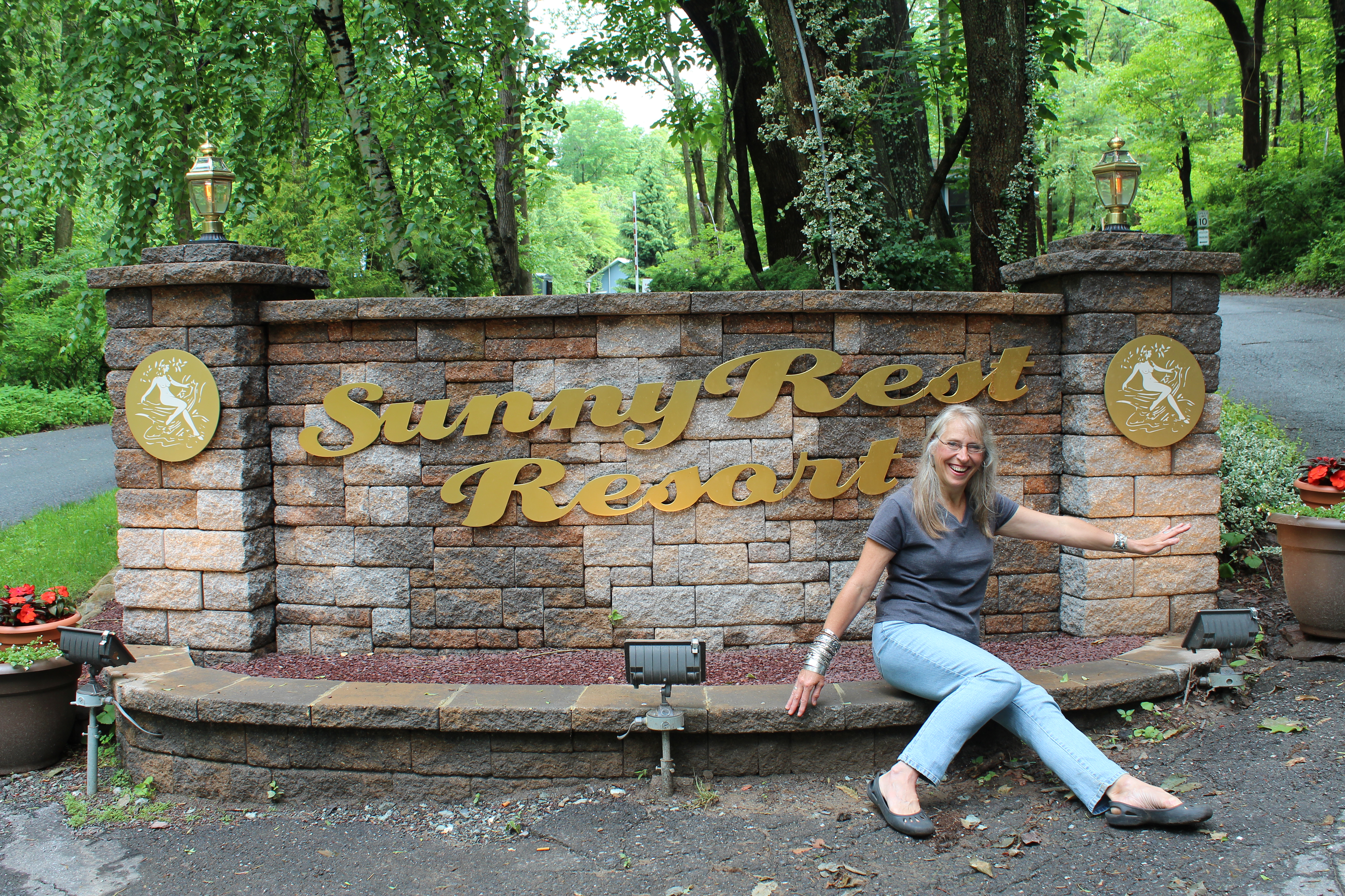 Sunny Rest 006I have no idea what to pack for a nudist resort get-away. “Very little in the clothing department,” my husband and daughter tease. But it is chilly this June weekend, and possible rain in the forecast. What do they do under these circumstances, crank up the heat to allow patrons to go unclothed? This seems really stupid energy wise in the summer, but patrons do pay good money to go there and romp unclothed outdoors and in. When I ask the resort owner, Myra this question, she tells me the camp’s motto… “Nude when possible, clothed when necessary.” I could interpret the “necessary” part multiple ways.