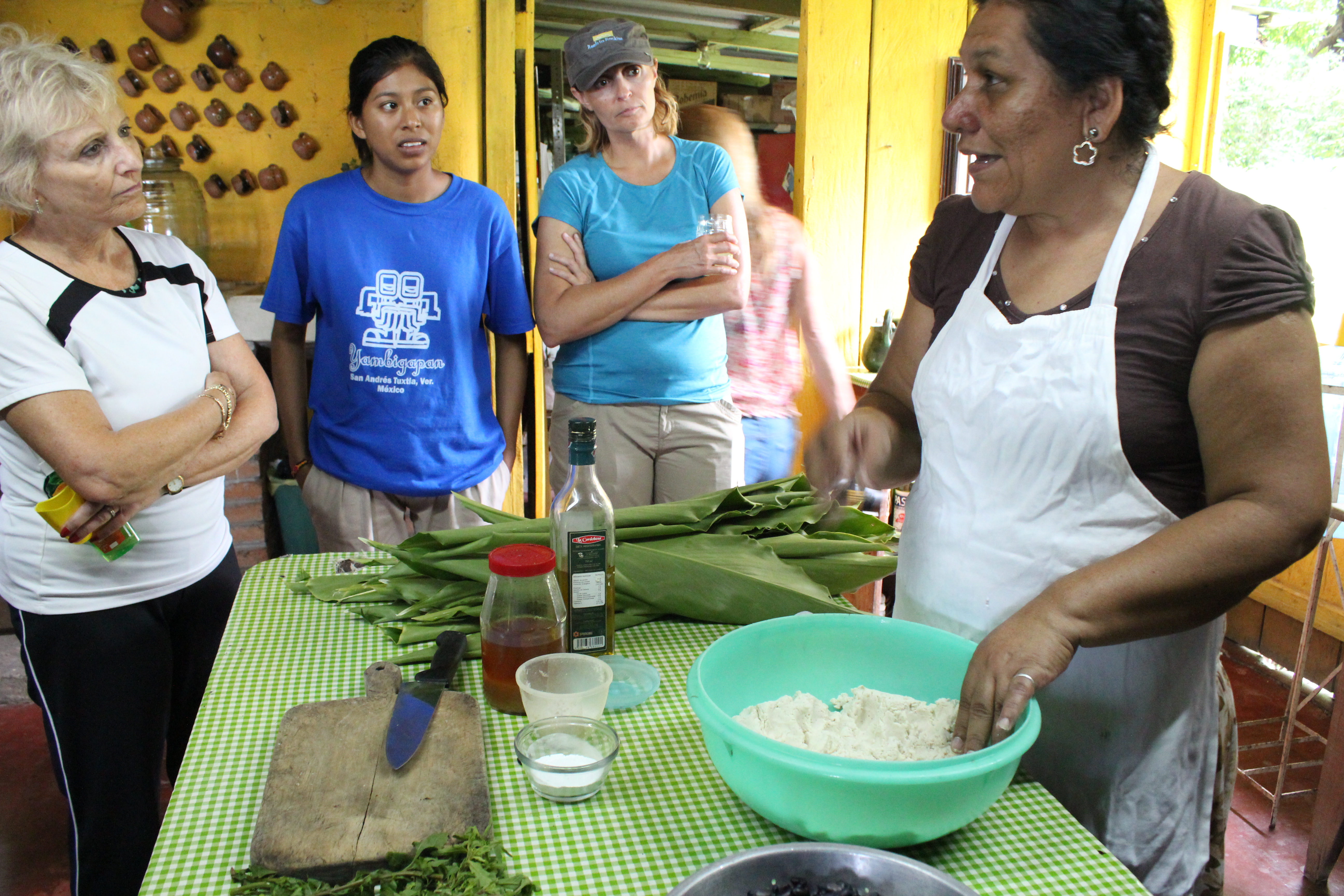 While on these adventures, we dined on amazing, authentic local food prepared by the mothers and grandmothers of the Hernandez family. But once again, Yambigapan took it one step further and allowed us to visit a garden where we could harvest our own bercighae leaves (to roll tamales in) with a hand-forged machete, then mixed in the corn stuffing (masa) and learned to wrap them into pretty green triangles for roasting. Before we ate our farm-raised red salmon, we got to catch them in a net.