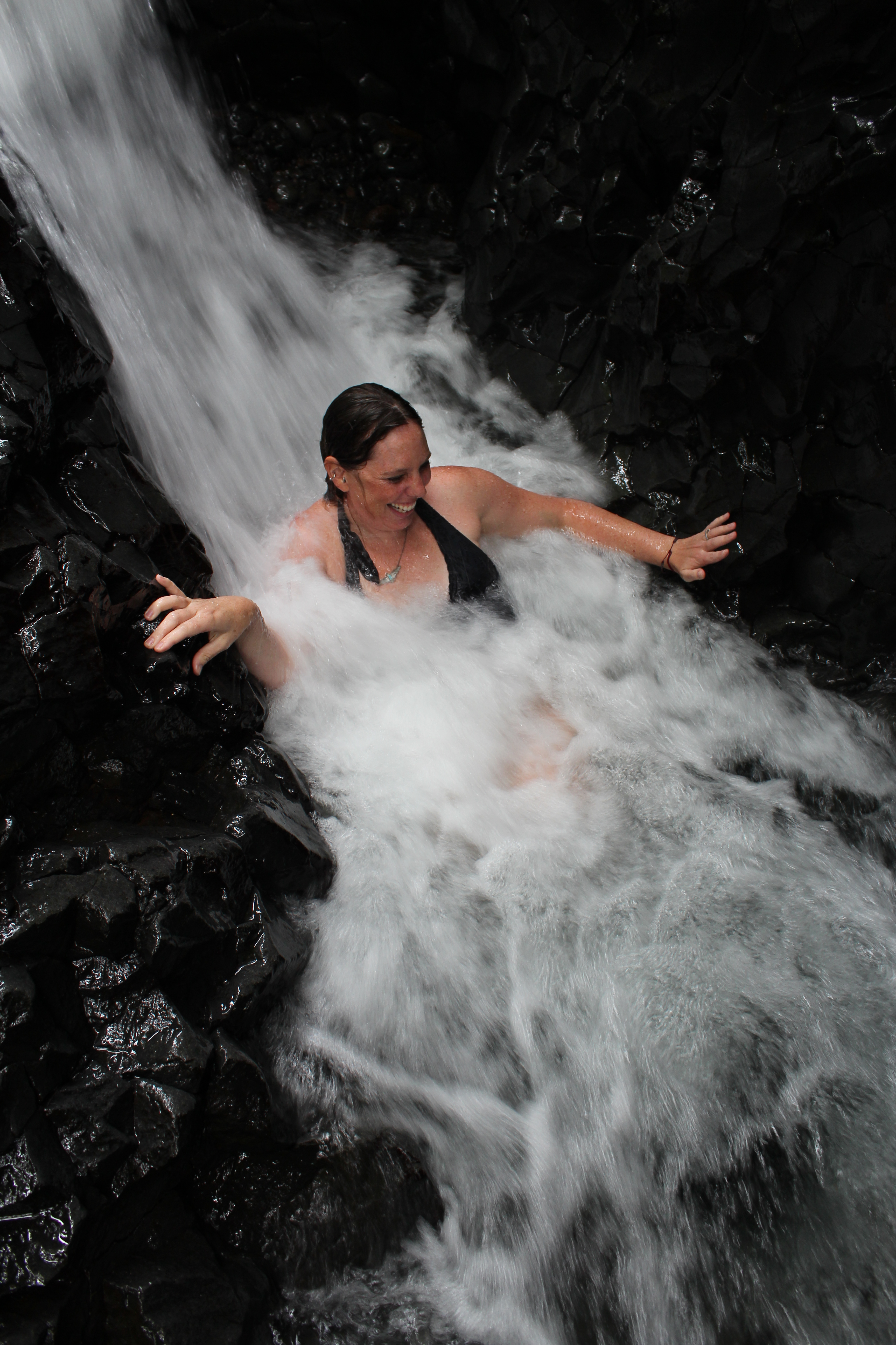 But Yambigapan went a step further, for we didn’t just rappel down a rock face but a basalt sea cliff and then free repelled over a sea cave where pirates once hung out, into a rocking fishing skiff in the sea. And at the end of the lava tube cave were thousands of roosting bats which decided to exit the cave and brushed past our heads, shoulders and arms as they whizzed by. And our horseback ride ended at a waterfall for jumping and deep pools with pounding cascades like a deep tissue massage on our backs.