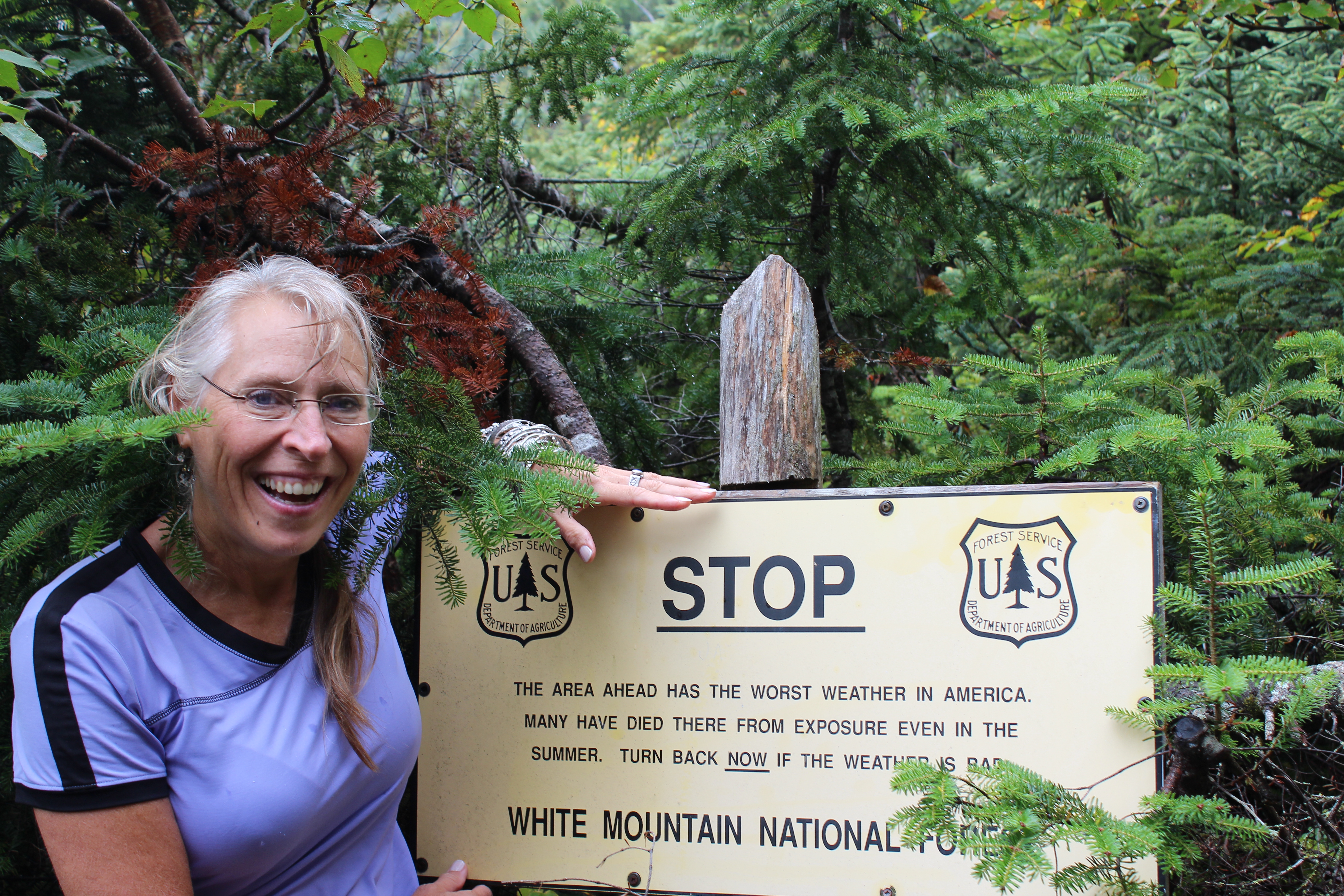 We picked our way up the great north-facing glacial cirque between these two giant mountains, up the headwall to Edmund’s Col on the ridge…a place where the Appalachian Trail touches, where I have not tread for 34 years as a thru-hiker. AS we break above treeline, we encounter the famous White Mountains sign: “STOP! The area ahead has the worst weather in America. Many have died there from exposure even in the summer. Turn back now if the weather is bad.” This sign always gives us pause and with that reminder, we pulled out our wind jackets.