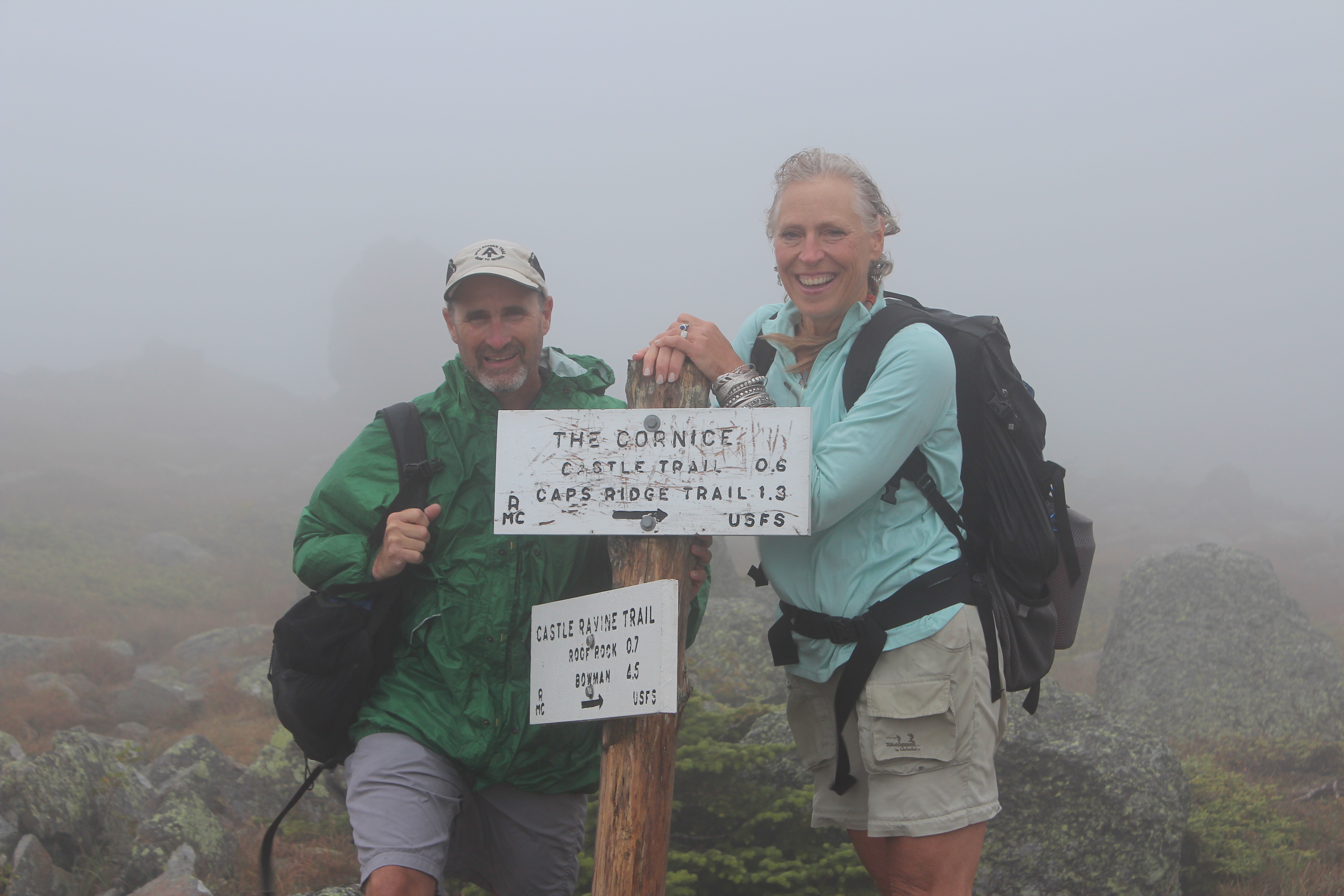 When we gained the ridgeline, all was misty and foggy. Al and I leaned on the sign for a few pics and it felt good to be back.