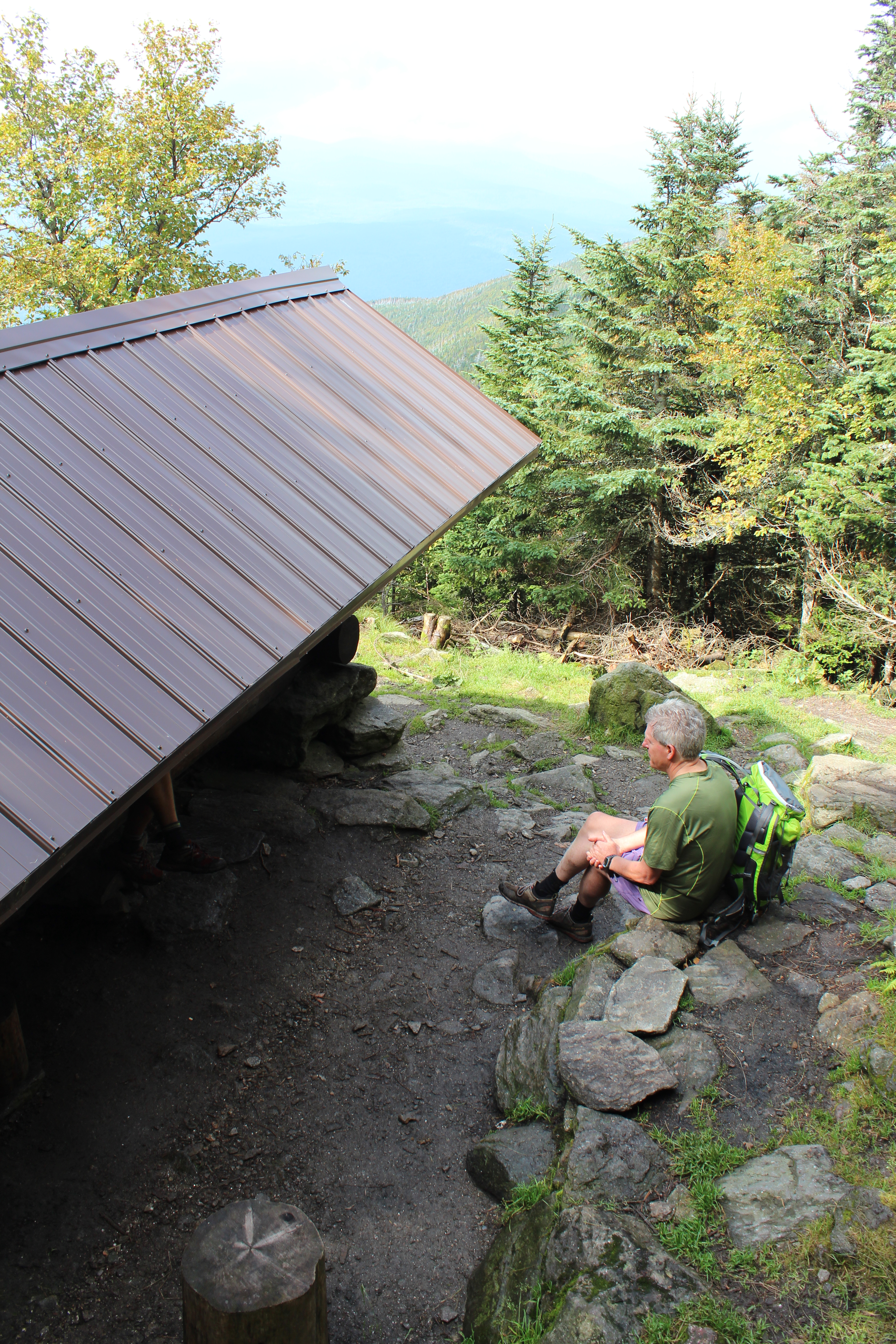 We traversed the Randolph Path over to Israel Ridge, past a gigantic boulder of white quartz that shone through the fog like a beacon. This 410 million year old rock was formerly sand in a huge submarine deposit. By the time we descended the ridge, the fog had burned off and we were treated with stellar views out across the Northern Presidentials  and the cirques below. We stopped at The Perch- a three-sided log shelter that is available for overnight camping, maintained by the Randolph Mountain Club. The club has 4 such shelters. I thought to myself that this would be a great place to be a caretaker, an employment offered by the Randolph Mtn Club each year- it would be a good place to finish my new book…a task I should perhaps be working on that exact moment instead of climbing on these trails! But I think it is important to make the time for just a simple quick day hike like this, to experience the beauty of the White Mountains. It had already been many years since I was here, when would I return?