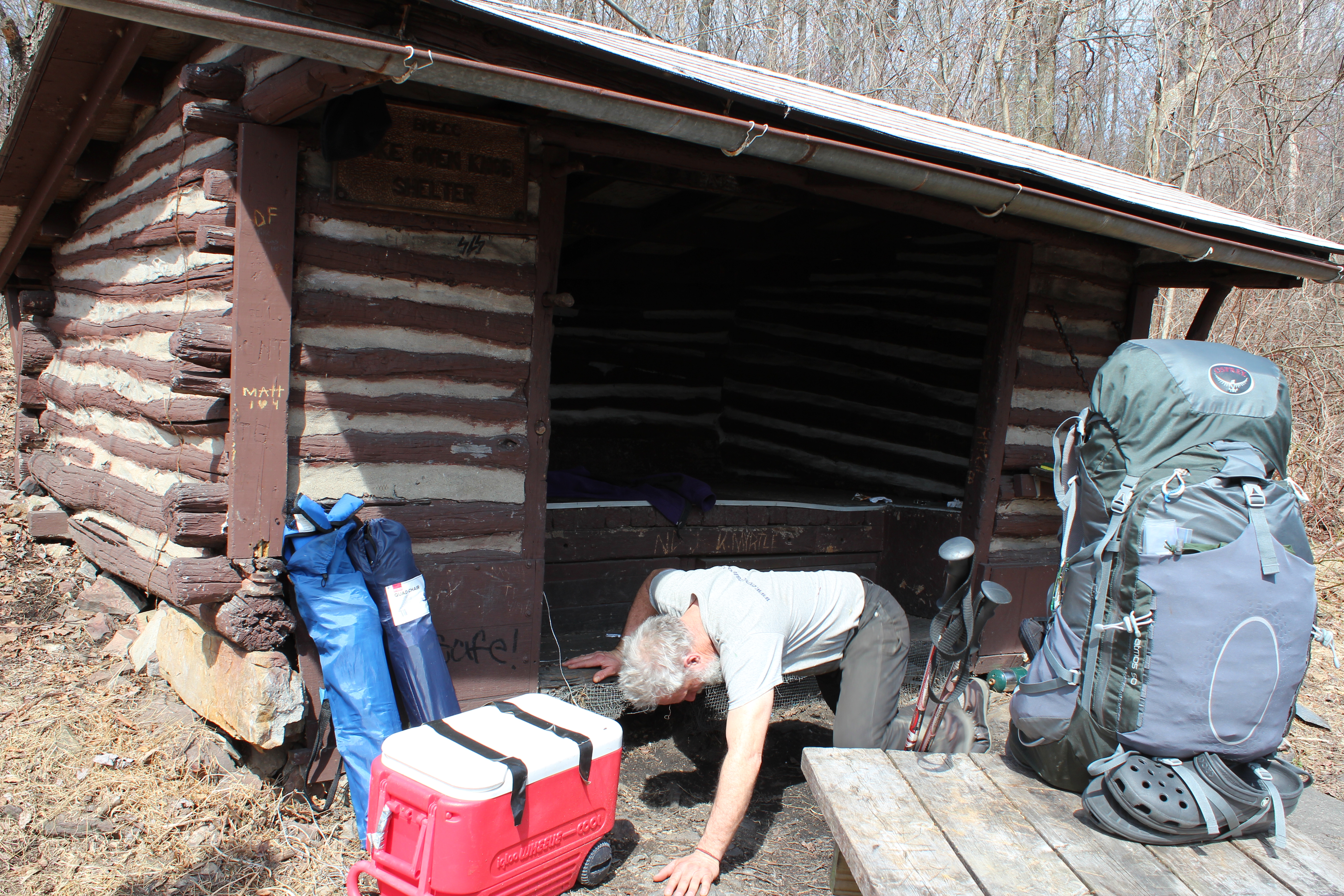 I forgot how gross a job it is to clean up an Appalachian trail shelter after the winter breaks. There is trash everywhere, soggy toilet paper, used menstrual pads. It’s a good thing we brought along disposable gloves.