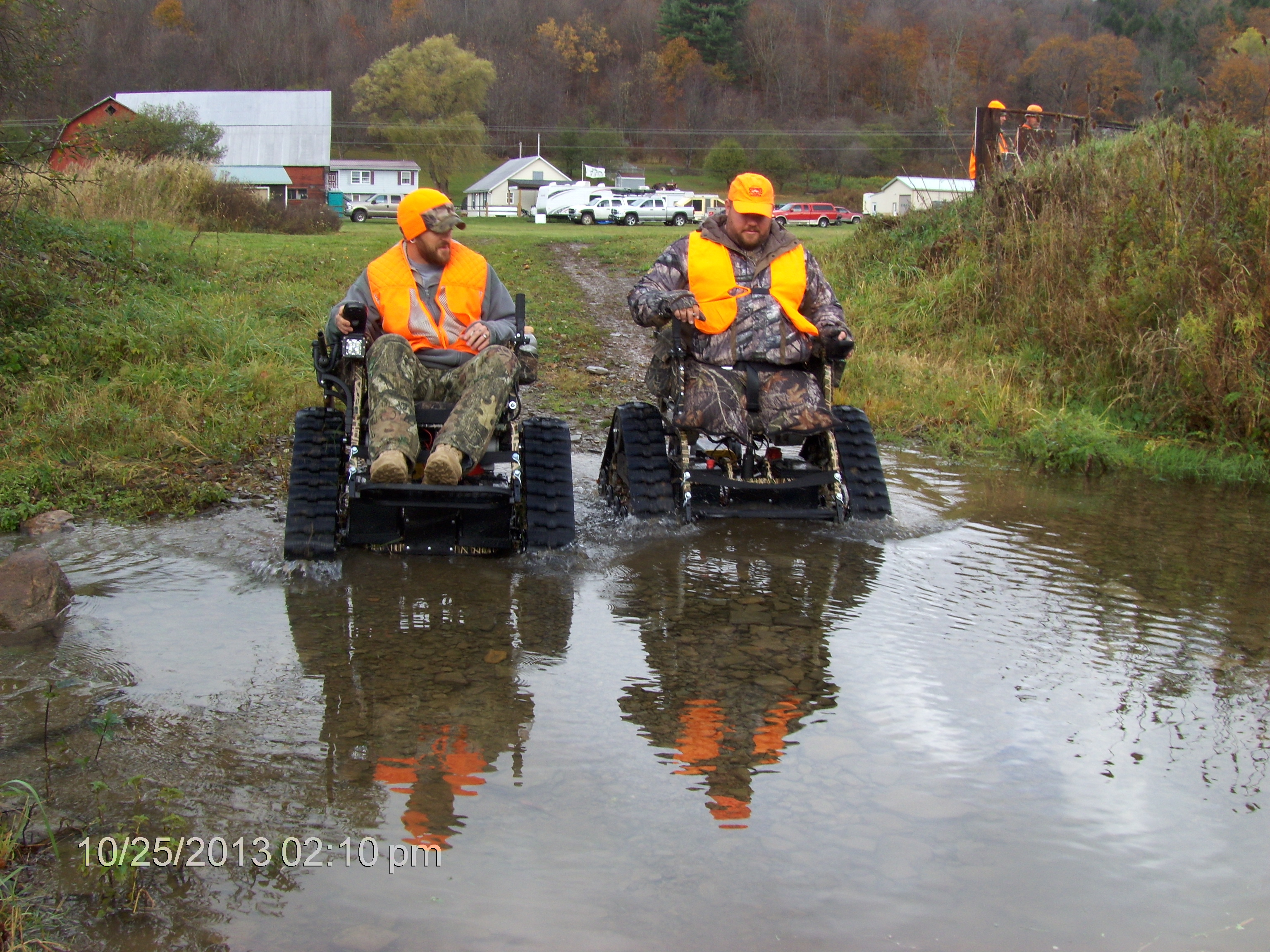 Ed takes Liz and I to his garage where he shows us an Action Trackchair that will climb up steps and over logs. This sit-down version has removable attachments to hold a rifle and a fishing rod, costing between $12-14,000 apiece.