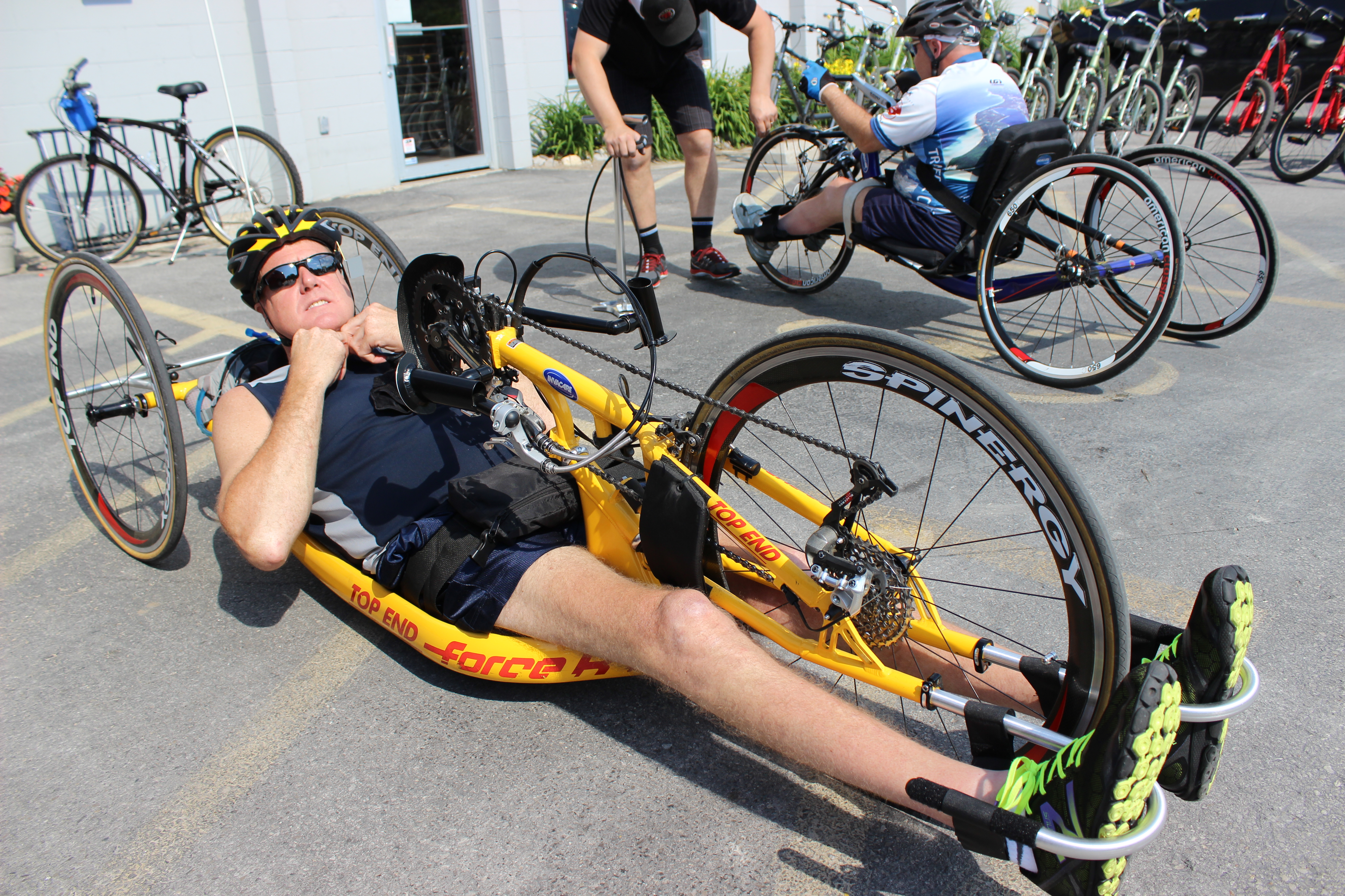 Then there is John who became paralyzed at the age of thirty-two from a snowmobile accident. He rides a recumbent bike that he hand cranks but unlike Steve, is able to sit up.
