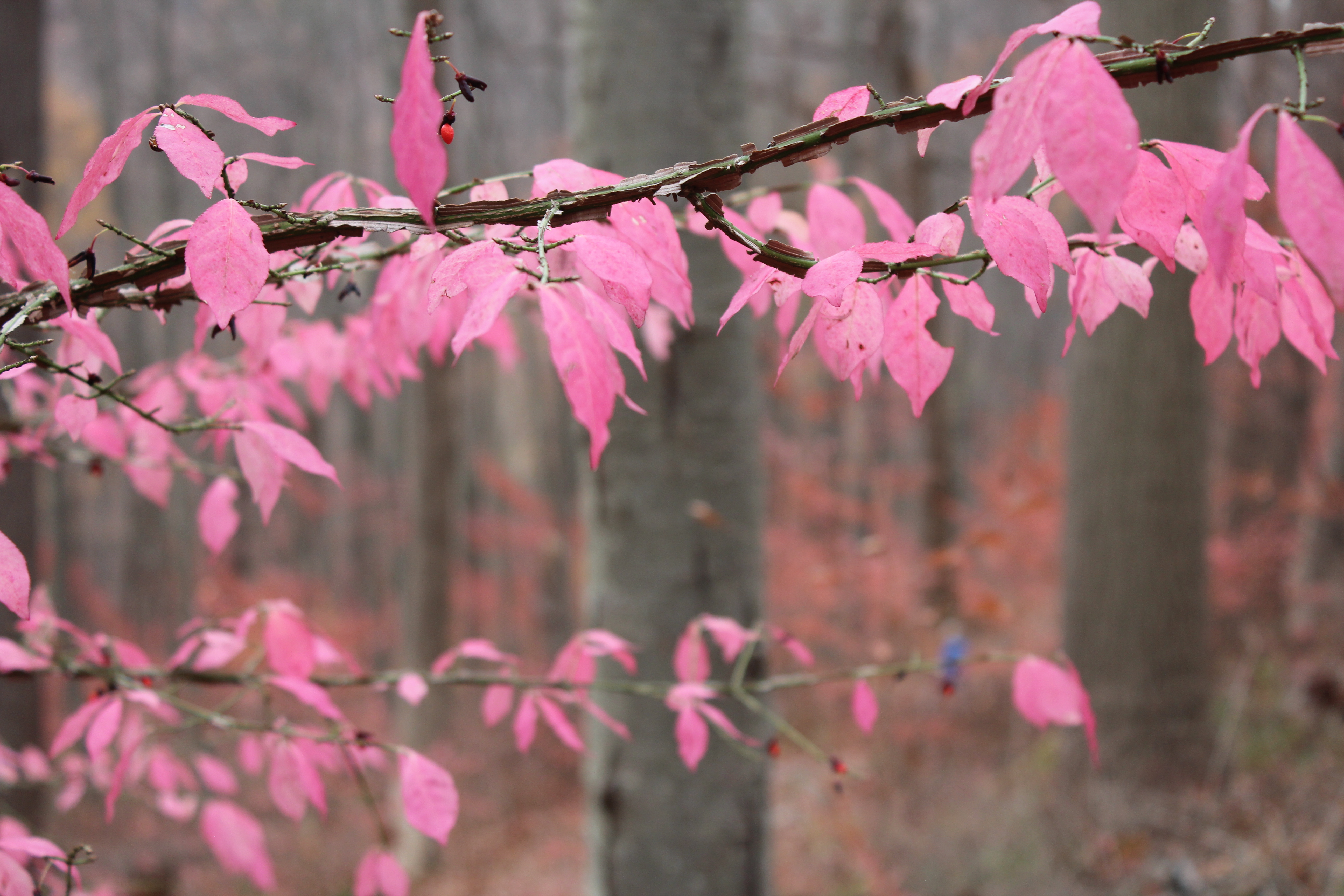 Bryce and I traveled to New Jersey to hike the last two hikes for the story today and we were hard pressed to find any color hanging on. An occasional beech tree with its fluttering, paper-thin leaves. And a small red shrubby tree down low, that had beautiful rosy pink leaves. When I touched them gently with my finger tips to examine them up close, they all tumbled off the branches and floated to the ground like confetti. Their days are numbered too. In fact, later tonight, they will drop off too as the rains come.