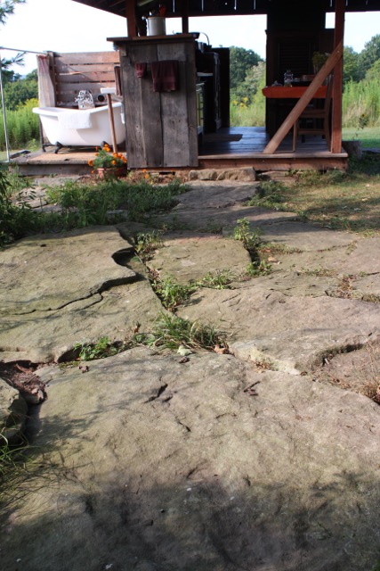 In the evening after dinner, we sat on the 8 x 12 foot porch in our bath robes and sipped wine after going for a walk on the many mowed paths around the 1786 historic Campbell Farm. That was after we soaked in the tub listening to coyotes and screech owls call and watched a doe and her two fawns come out to feed as well as watch the fingernail moon rise in the night sky It was all so very lovely. I sat there and realized how little of “my stuff” that I really need. I was aware of how little stuff we really need to be happy from all my experience backpacking all my life. But for whatever reason, we tend to gravitate INSIDE when we are at home- that is where our STUFF is. But I told my husband that I want him to think about building an outdoor sleeping space and a cooking space. We already have a few picnic tables that we drag every meal out to when the weather is nice and “Nice” is stretched into the “shoulder” seasons.