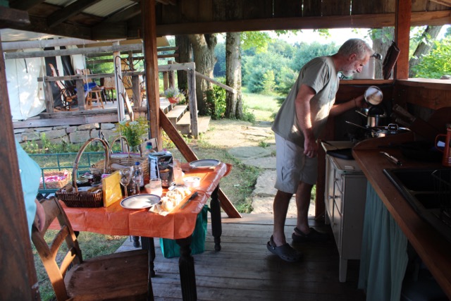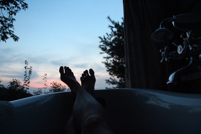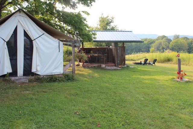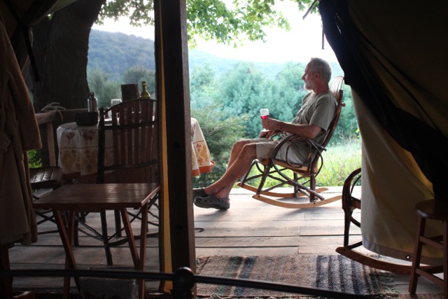 I was attracted to the whole idea of Glamping when I saw the photos on their website. The large canvas wall tent reminded me of my fond memories of “camping” in the Tanzania bush. But Todd and I were even more impressed when we arrived. A wagon sits by the parking area to pull your belongings over the grassy hill to your secluded camp spot. A constant breeze blew so bugs were never an issue. Gas stove, fridge, tub and bathroom, are all completely outdoors except for one wall to each “room.’ The bedroom is separate, inside the large 12 x 12 foot screened in wall tent, complete with queen sized bed (mattress warmers which we did not need in August!), oak night stands, electric lights, rugs etc.