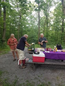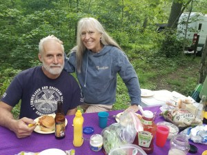 As his supportive wife, I also wasn’t going to let him get away with becoming too comfortable in his “old age.” This year, on the night before his actual birthday, we drove to the camp sites on the Weiser State Forest tract above Port Clinton. Two of our cycling buddies, DJ Duncan and Dave Broomhall, surprised him and arrived after we made camp. They brought their mountain bikes and the plan was to ride across the top to Hawk Mountain and back and then enjoy a good birthday meal around the campfire. On our return, I threw down my bike at the fire tower and yelled to the guys, “Let’s see if we can climb it.”