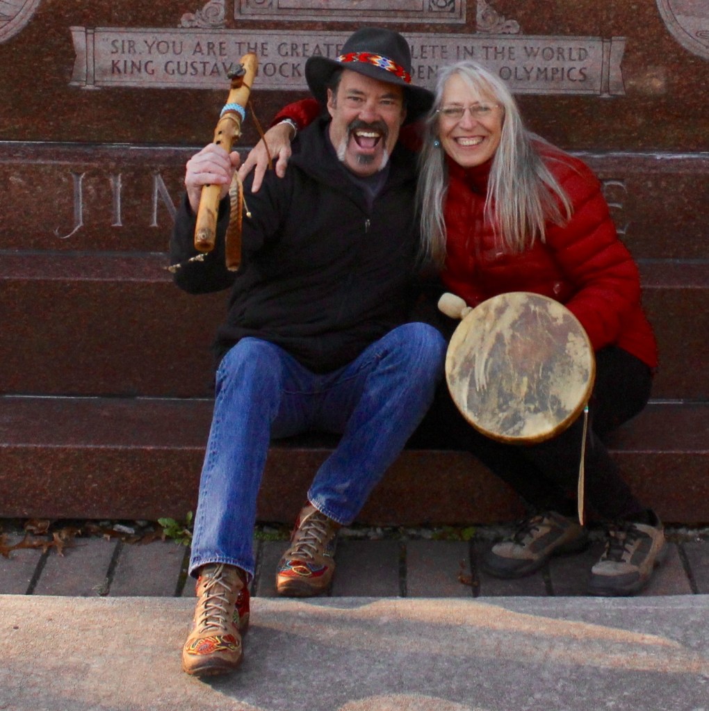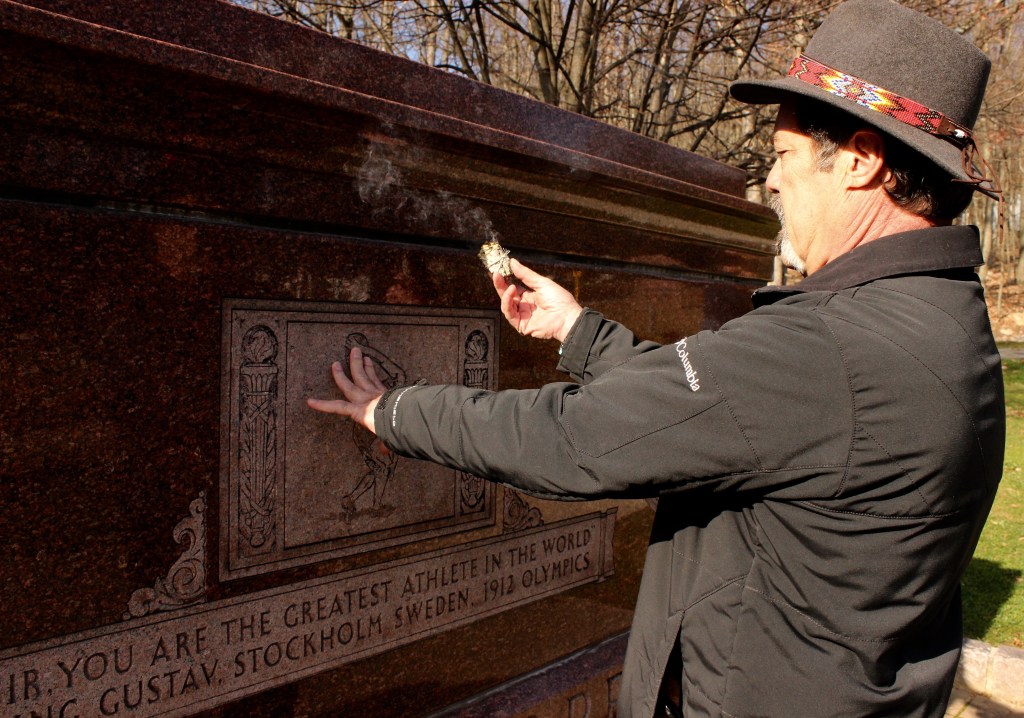 Smoke billowed from the burning sage bundle as the man in the wool felt brimmed hat circled the mausoleum. All four sides were smudged, all four directions. The man gently touched his fingertips to the marble monument and spoke to his grandpop and all his relatives whose physical bodies had left this planet, saying hello and thanking them for their continued presence in his life. The man clearly resembled the man in the photographs displayed in an outdoor exhibit a few yards away- Jim Thorpe, especially around his eyes and forehead… as he should, for this was his grandson, John.