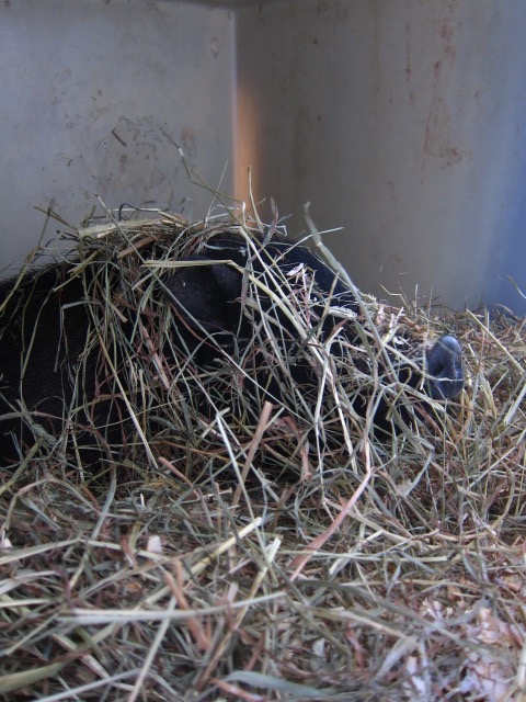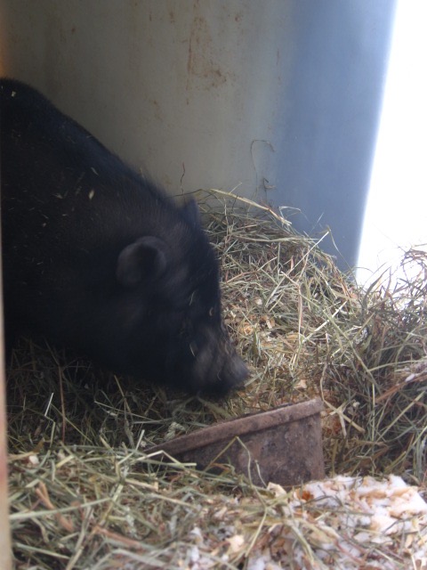 Todd got a large plastic tub that is 3 ft x 5ft, turned it on its side, positioned it by the chicken house so no weather could get in, hammered stakes into the ground so it couldn’t move, filled it with sweet hay, put out bowls of food and water, and the little black piggie made himself at home.