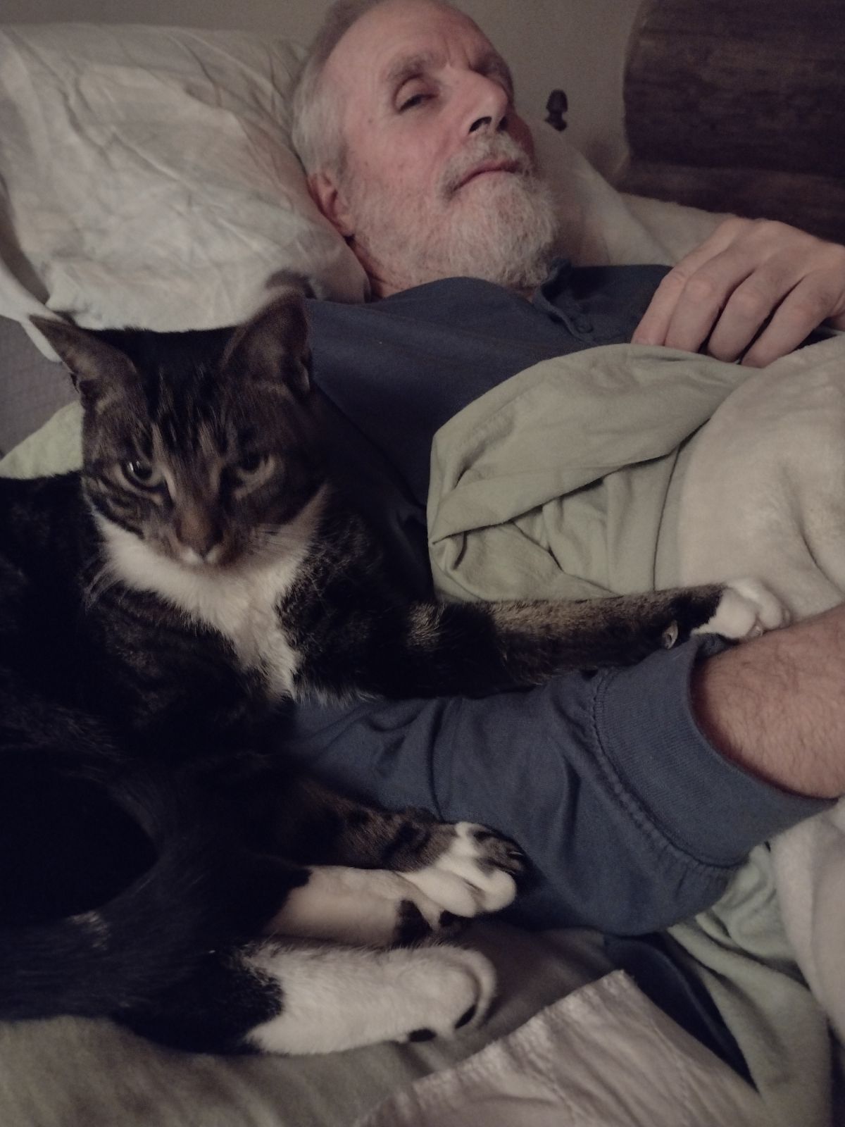 Our kitty (Nickels) has been missing a lot lately. He is gone for much of the day and even multiple days. We miss him a lot and Todd especially needs him to comfort him and keep him company and lift his spirits up. He is a therapy kitty. They have a very close connection. The other night, Todd was feeling glum about his right hand and arm not coming back as fast as he hoped and he said to his kitty who was laying in his bed with him, “Give my arm some love and help it come back,” and the cat immediately stretched out both of his front paws and laid them lovingly on Todd’s arm. We said, “Wow, he is psychic.” Her is in Todd’s bed in the am as he wakes up and lays with him as he goes to sleep at night.