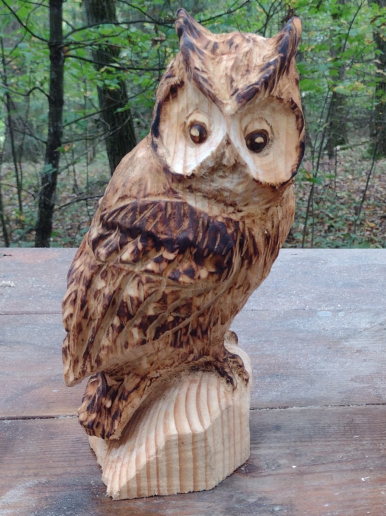 Two friends from our hiking club come over periodically to block out chunks of wood for Todd, which will become owls. That’s the first step. Then carving, die grinding with a forum, burning, sanding and then finishing with log oil finish preservative. He can’t make his carvings without help, but then again he can’t do much himself without help these days.