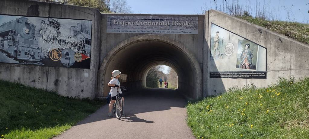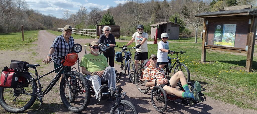 Half way- 75 miles-  to Pittsburgh from Cumberland on the Great Allegheny Passage-our first stretch on teh Great American Rail Trail, and we are doing well! Had a few rough spots but we are stronger every day. The first day Todd didn’t realize that he did not activate his e-assist and he rode 5 miles on just his beastly power! The second day, as soon as we were dripped off by our professional shuttler, Rod Mann, Todd could not move very fast. He thought his legs were just really tired from the day before. He was only doing 3 MPH and I’m thinking- how are we gonna do 25 miles ? He stopped and said, β€œIt feels like I have my break on” and sure enough he forgot to take his parking brake off! Now today, day 3, it was freezing cold in the 40s and very windy and I didn’t know how far we would get, but we did great. Todd even said that if the sun had come out and his hands wouldn’t have been so cold and stiff, he could have done another 10 miles. Every day he feels better, so does our veteran, Danny Stein. Today, Dan had a really hard time because he didn’t realize his two front tires were half way deflated. Tomorrow, we will fix that! The trail surface was very soft too from the pouring rain last night. But we are right on schedule and ready too crank the miles up to 30-32 in the next few days. Todd’s legs were a little wobbly when he got off the bike the first two days, but today, day 3 is much better.