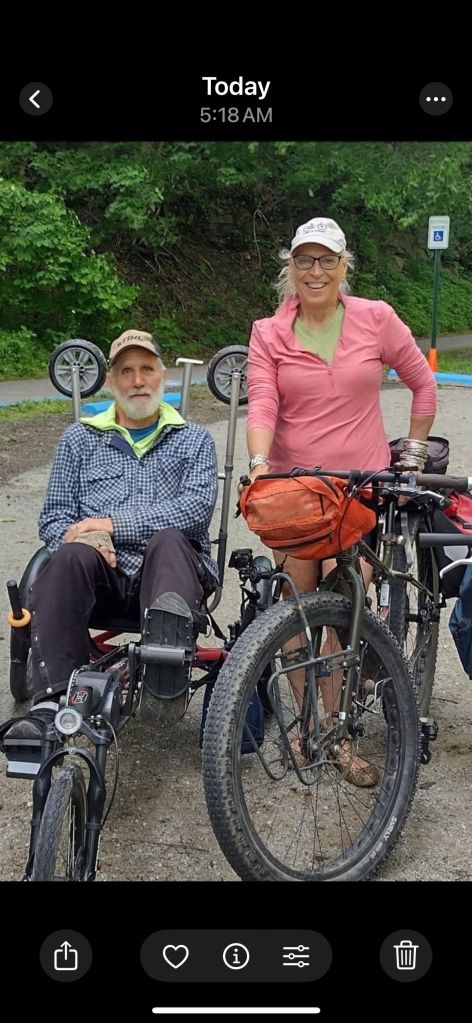 When we visited Todd’s physiatrist (physical therapy doctor) for his three month Botox injections which manages his tone (dystonia- involuntary stiff contracting muscles), we talked about Todd’s injection schedule. We wanted to plan it around our trips cycling the Great American Rail Trail and make sure his body was at its optimum best when we rode. The injection peaks after a week or two and remains high for a few weeks until its efficiency decreases towards the end of the three month period. What he said after we shared our plan of cycling 2,000 miles across the country as we raise awareness for the need for accessible trails for the disabled, made us smile. He said, “I would not recommend doing that. I’m not going to tell you not to do it,” and I cut him off, “It would’t matter what you advised, we are going.” Then he said, “At least let me consult with some of my colleagues to see if it would be a good thing or a detrimental thing for Todd’s body.” And Todd said, “Because they have gone on an extended cycling trip, as a quadriplegic or even able bodied and they would know?” The doctor smiled. I told him that we already know that Todd can cover a good 30 miles a day on his adaptive e-assist trike, and that is not after he gets into great cycling shape, which we expect to happen before too long. As we walked down the hall after our visit, Todd said,  “The number, 2,000 miles,  sounded overwhelming so he could probably not even fathom himself covering that many miles on a bicycle, let alone “as a cripple,” as Todd affectionately calls himself.