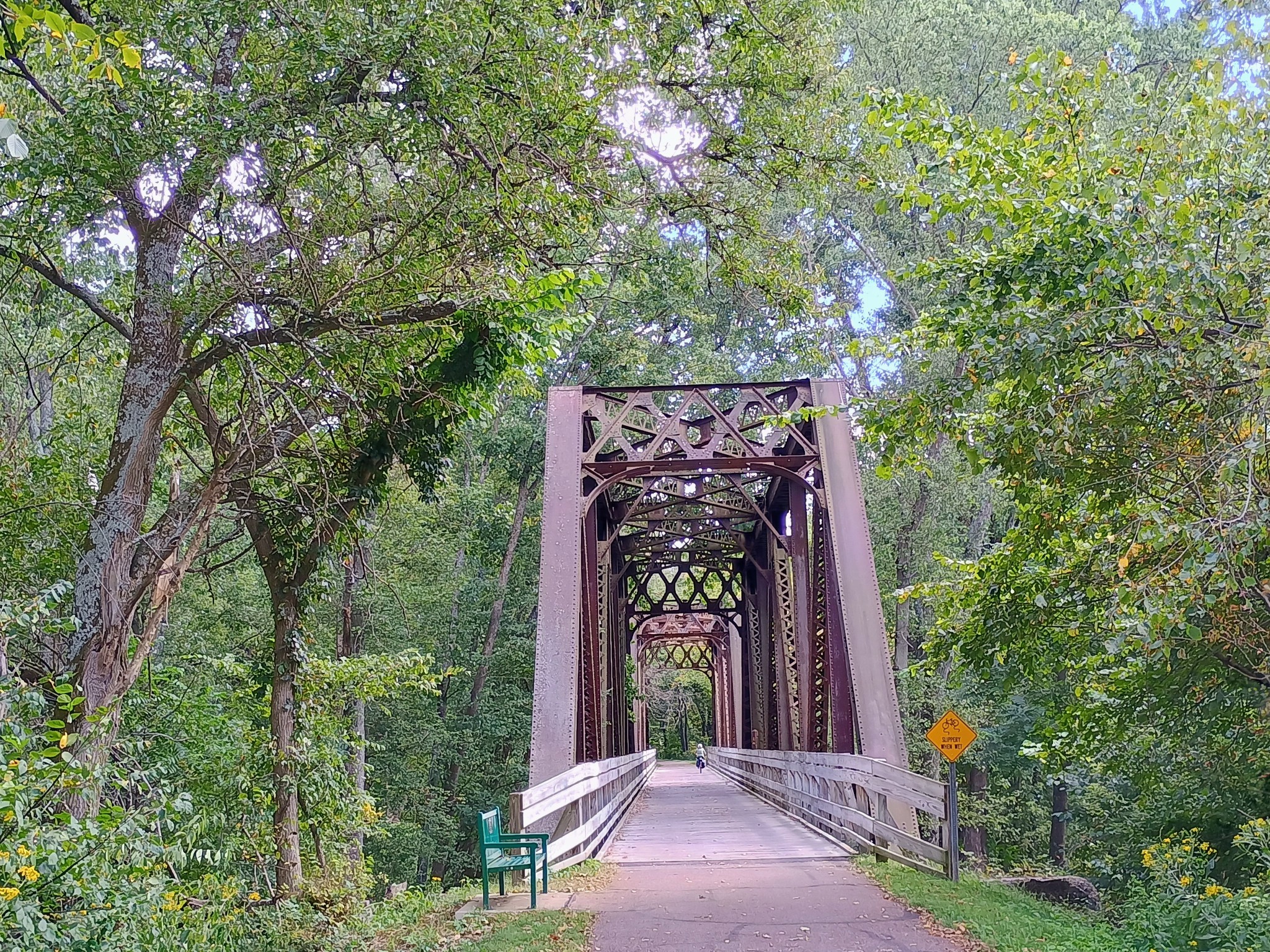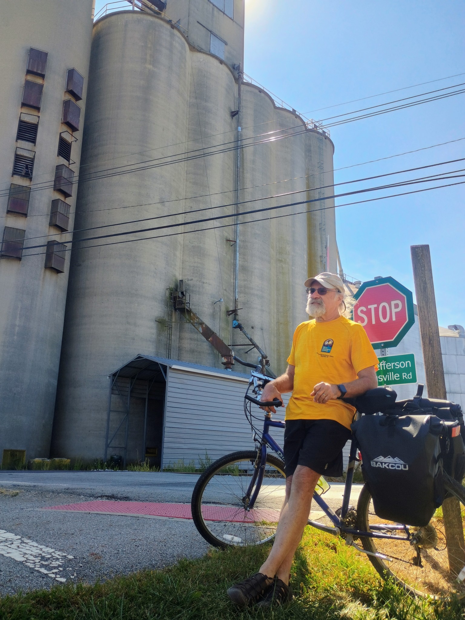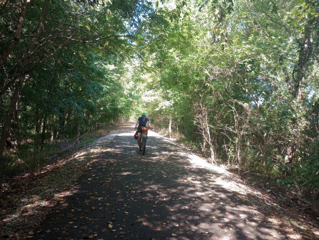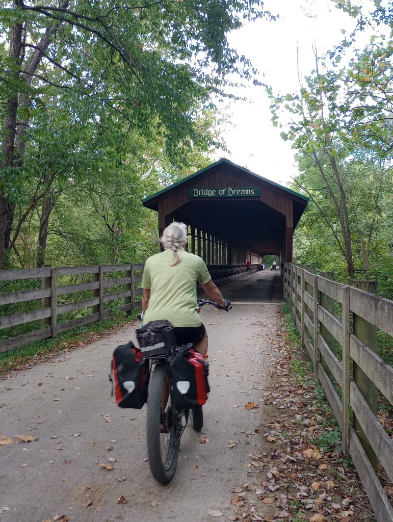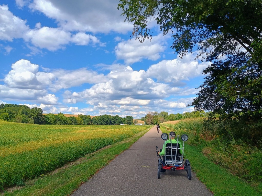 We started off our fall ride in gorgeous early fall weather- 70s during the day, blue skies and big puffy cumulus clouds. The scenery to our sides rolled and there was much to look at- barns and old cars and tractors and silos and enough shade to keep us cool. And then it got flat and then it got exposed and then it got hot and we got scared. What if this is what the rest of the ride will be like?…miles and miles of corn fields and soybean fields in the sun. Thank goodness most of the rest of this fall’s ride was shady with trees on at least one side of the trail, and sometimes a beautiful sheltering canopy from the heat. The trails in both western Ohio and Indiana were all blacktop and enabled us to roll nearly effortlessly, (unless as in Indiana, the trail had huge cracks in it and needed repair, especially for Todd who had to aim all three individual tires on his trike).